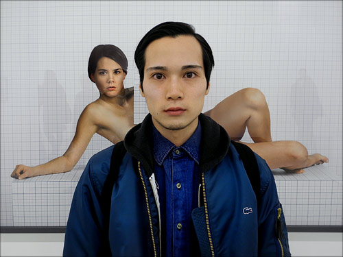 Übersetzung fehlt Junger japanischer Fotograf vor einer Arbeit des Künstlers Charlie White in der Galerie Loock, Potsdamer Straße, 2014