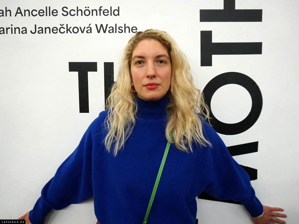 Künstlerin mit blauen Pullover vor Wand-Logo