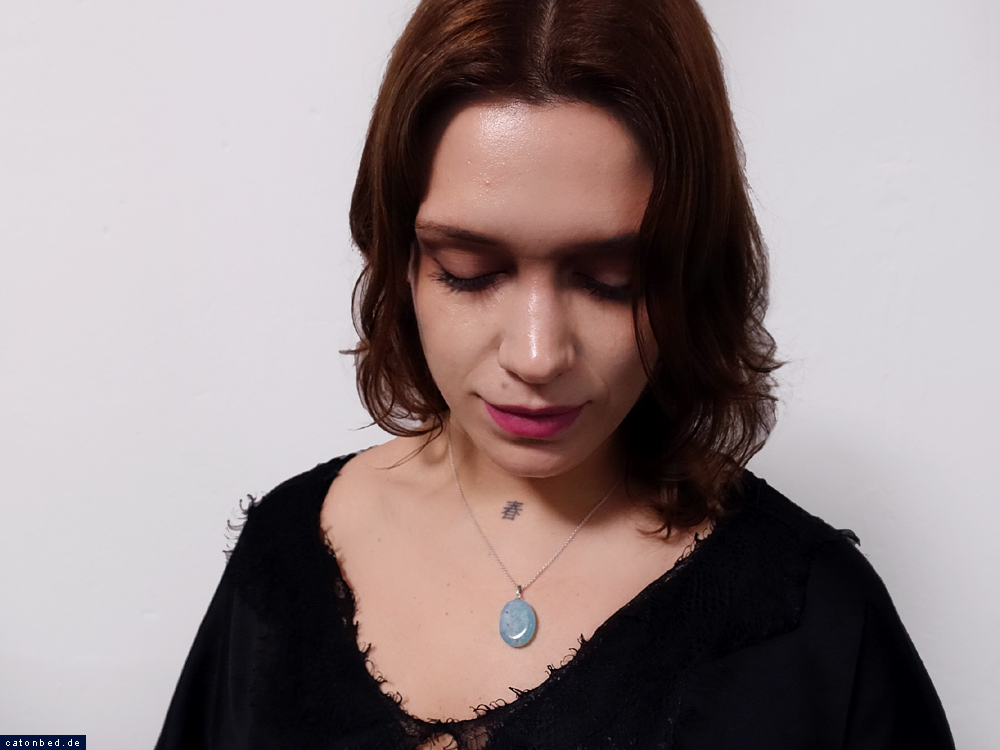 Frau mit blauem Stein, Augen niederschlagend